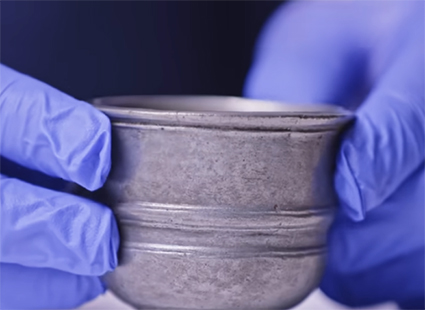 Da metallet er giftigt, ifører Angus Patterson sig først handsker. Koppen befinder sig i en læderæske, der igen er omsluttet af en stråæske.