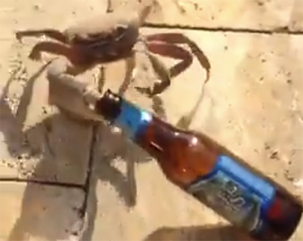 Der er sikkert nogle af vores læsere, der smutter sydpå til sol og varme i vinterferien. Men pas på krabberne, hvis fx solnedgangen skal nydes med en god flaske vin eller en øl på stranden. Noget tyder nemlig på, at krabber har hang til den slags. Det viser en sjov lille film på YouTube, hvor en krabbe stjæler en ølflaske fra en mand. Og det er bestemt ikke let for manden at få den ud af krabbens stærke klo.